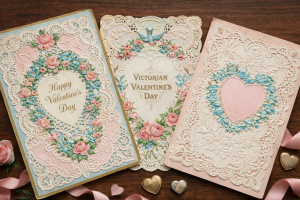L’Angleterre victorienne se prend de passion pour l’échange de « Valentins », des billets doux anonymes richement décorés de dentelle de papier, de rubans et d’illustrations allégoriques. Aux États-Unis, l’entrepreneuse Esther Howland flaire le potentiel dans les années 1840 et lance les premières cartes produites en série, démocratisant la fête.